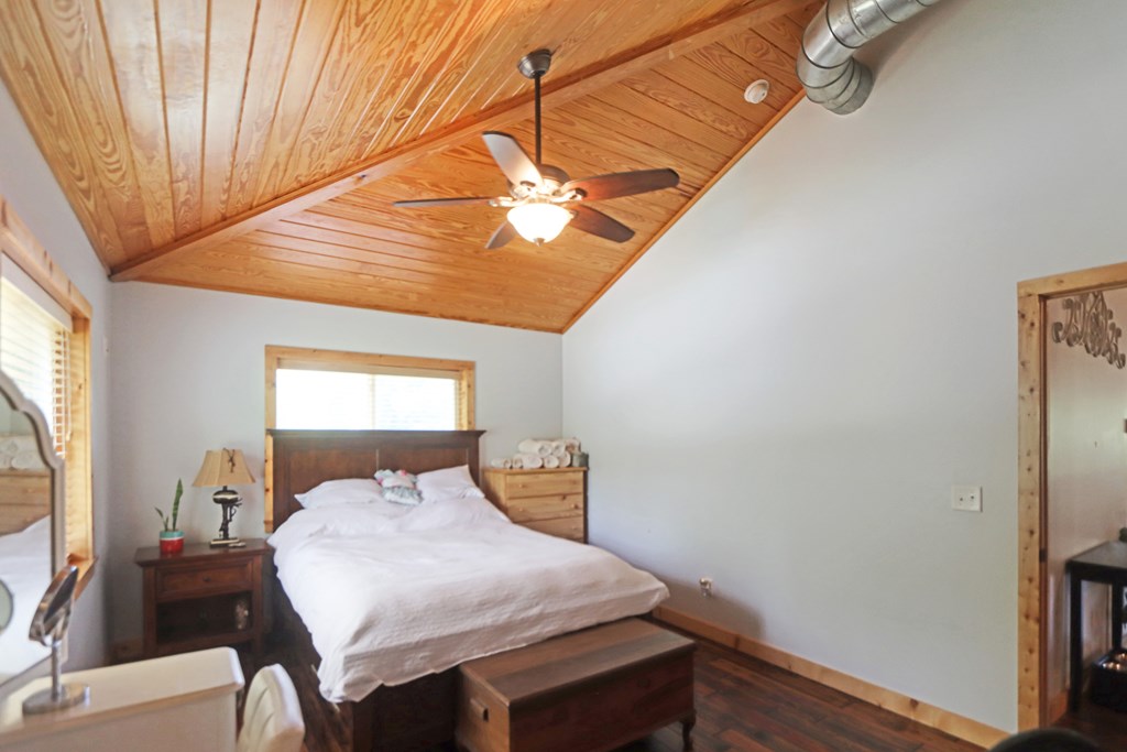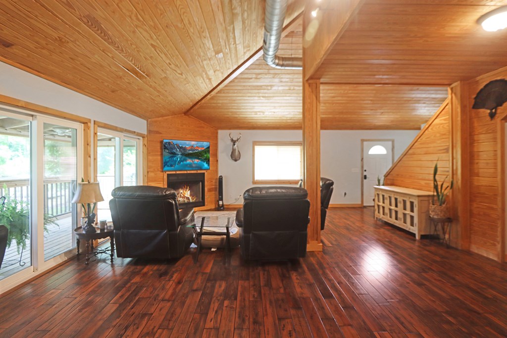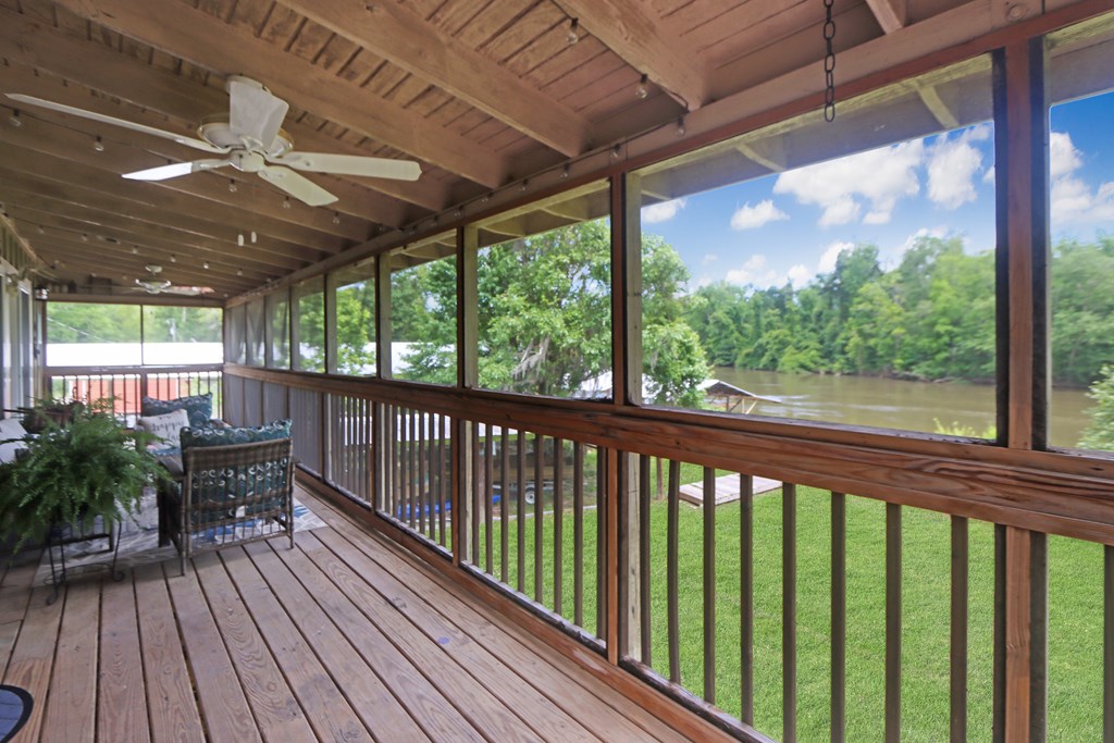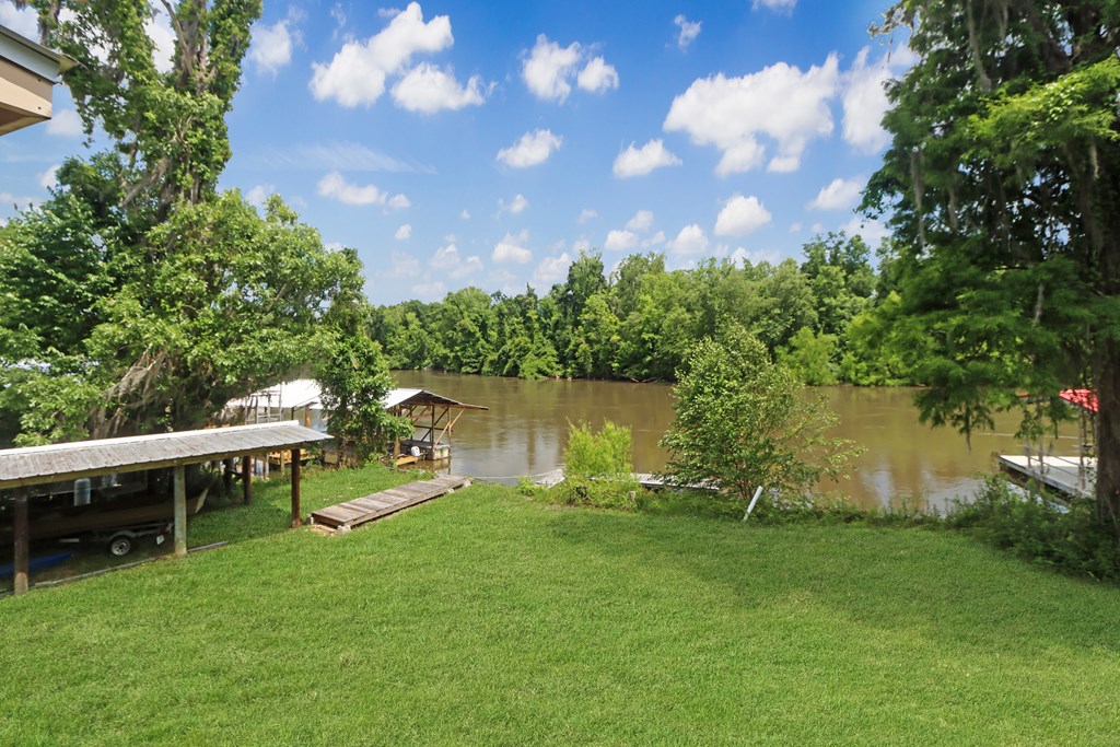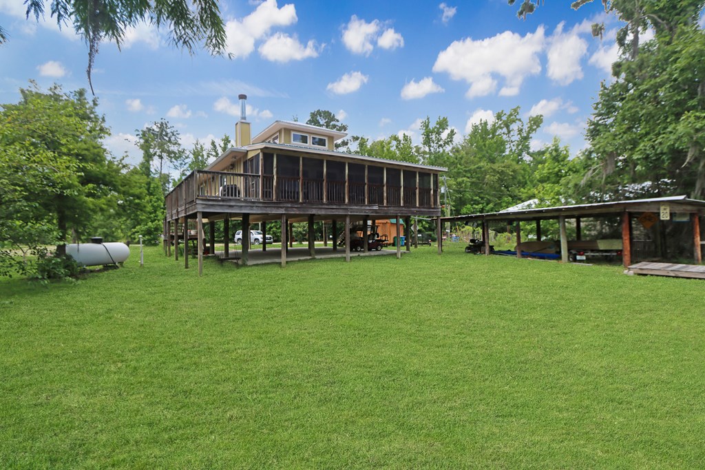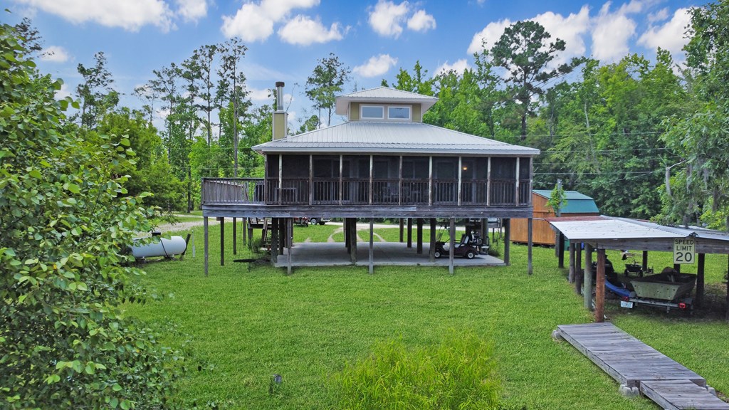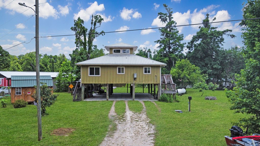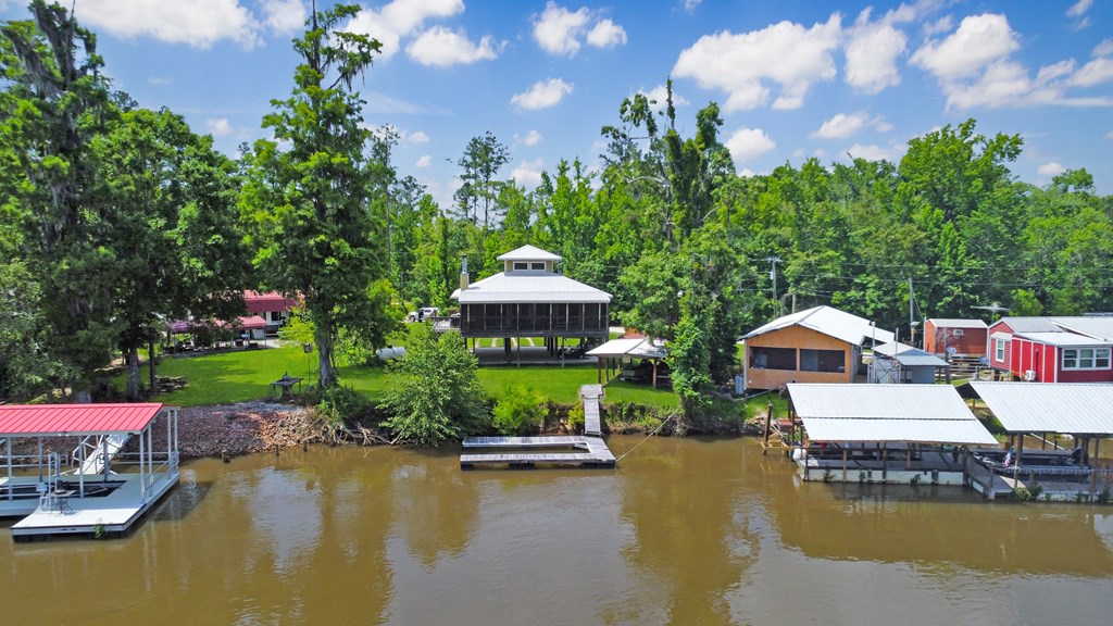Welcome to this beautifully appointed 3-bedroom, 2-bath riverfront retreat where timeless charm meets modern convenience. Nestled along the water's edge, this elevated home offers panoramic river views and a private boat slip just steps from your door. Inside, you'll find warm hardwood floors throughout and striking tongue-and-groove ceilings that add rustic character and charm. Natural light pours in from large windows and sliding glass doors, filling the open living area with a bright, airy feel. The living space flows effortlessly onto a screened porch and open deck?perfect for entertaining or enjoying peaceful mornings watching the water. The kitchen features a gas range, ample cabinetry, and great workspace for preparing meals with ease. A stackable washer and dryer add functionality without sacrificing space. The main level includes a spacious master suite with en suite bath, a welcoming guest room, and a second full bath. Upstairs, a cozy loft/bunk room provides extra sleeping or hangout space with a view. The home's elevated design offers covered parking below, ideal for gatherings or additional storage. A Generac whole-home generator ensures comfort and security year-round. A detached 12 x 20 storage building and large pole barn provide ample space for your boat, mower, tools, and outdoor gear. Whether you're looking for a weekend getaway, vacation rental, or full-time waterfront haven?this property delivers the perfect balance of comfort, character, and lifestyle.