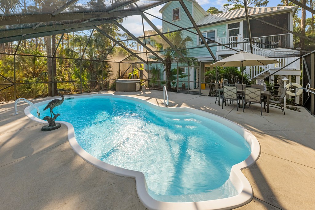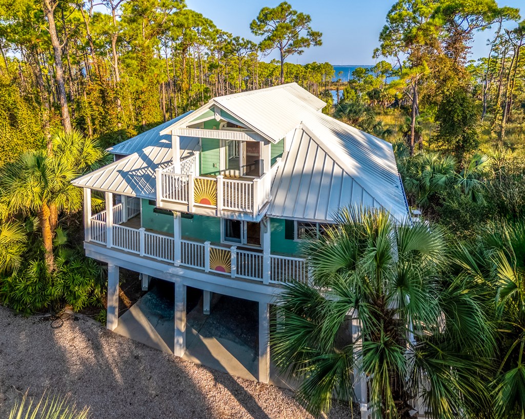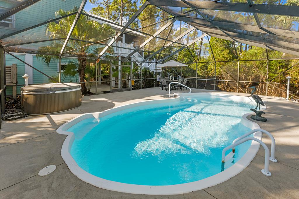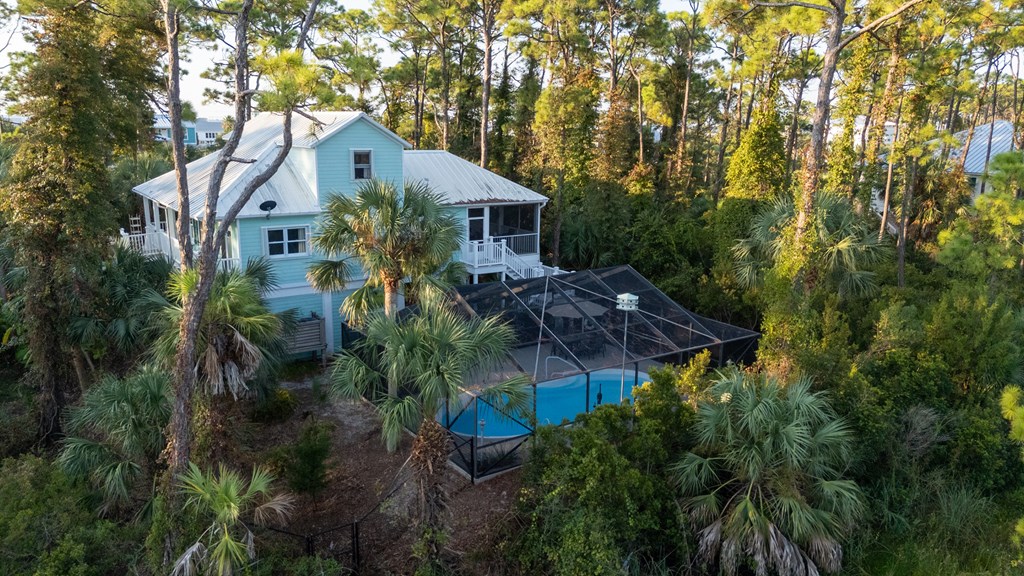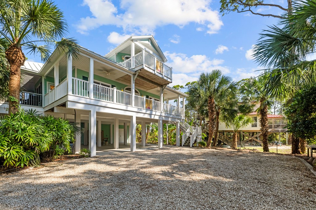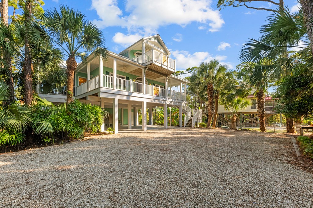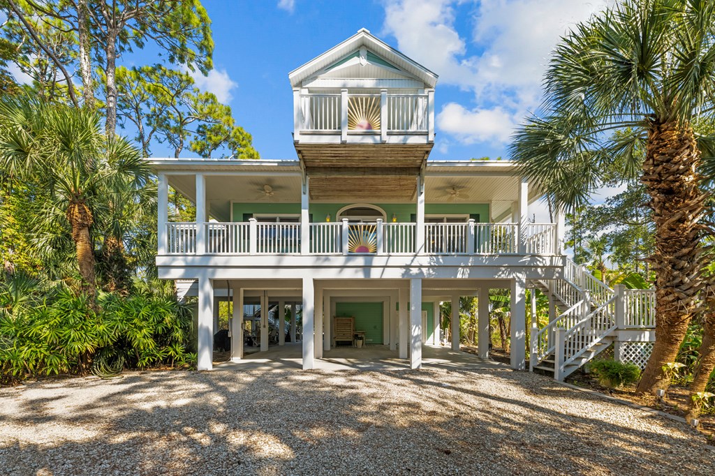 Your private tropical sanctuary with forever bay views awaits! This one-of-a-kind home was custom built by respected local builder Heath Galloway and is full of thoughtful details and timeless craftsmanship. Offering three spacious bedrooms and two and a half baths, it's designed for true island living, with every room opening onto the expansive porches. The home boasts ample natural light, tile flooring throughout the main areas, and brand-new kitchen appliances installed in 2025 and the peace of mind of new HVAC systems in 2025. The master suite upstairs is a true retreat, tucked away with its own jacuzzi tub, a private balcony with peek-a-boo Gulf views, and panorama vistas of the bay and tidal lagoons. The property itself is as special as the home with fully fenced and gated, shaded by mature palms, pines, bamboo, ferns, and fruiting banana and fig trees. It backs directly to the protected Apalachicola National Estuarine Research Reserve's Unit 4, a designated public park, with bay access ideal for kayaking, paddleboarding, and fishing. Your bay views are forever preserved, with bald eagles as your closest neighbors. The centerpiece of the property is the enclosed heated pool and hot tub, surrounded by lush tropical gardens, making it feel like your own private resort. Beneath the home, spacious storage and flexible entertaining areas provide the perfect setting for firepit gatherings, rinsing off in the outdoor shower after a day at the beach, or tending to garden beds. A lower-level restroom is continently located for uninterrupted pool days. For anglers, multiple fish-cleaning stations and a dedicated storage room complete the picture. All of this is just a quick golf cart or bike ride from St. George Island's pristine beaches and lively downtown. Whether you're searching for your forever home or a unique rental investment, 625 E. Pine Ave is truly a rare island gem, only steps from the beach, that blends comfort, privacy, and the best of coastal living.